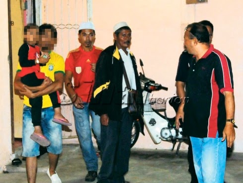 | Suspek (kiri) kelihatan mendukung anaknya sebelum ditahan pihak polis di lokasi kejadian. |